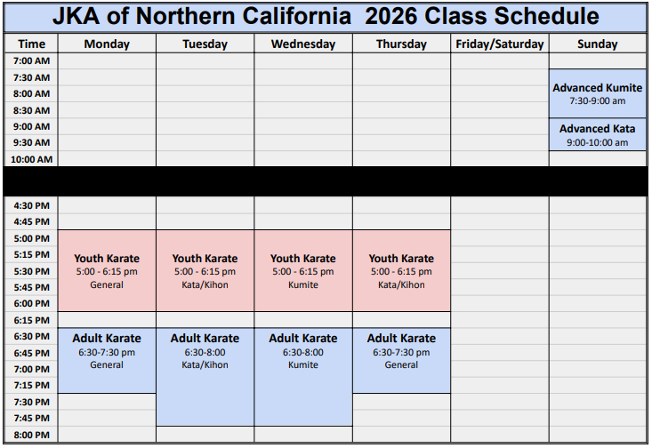 All classes are taught by Sensei Wauriman or another JKA NorCal Black Belt Instructor